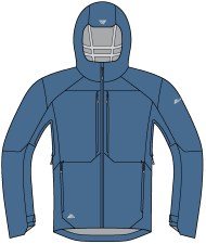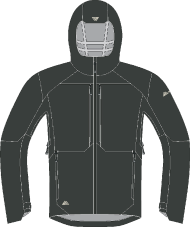 R’Tech alpine 3L: 89% Polyamid (30% recycelt), 11% Elasthan, mit PU-Membran (20.000 mm Wassersäule / 40.000 g/m²/24h).Gewicht (bei Grösse M): 440 g.